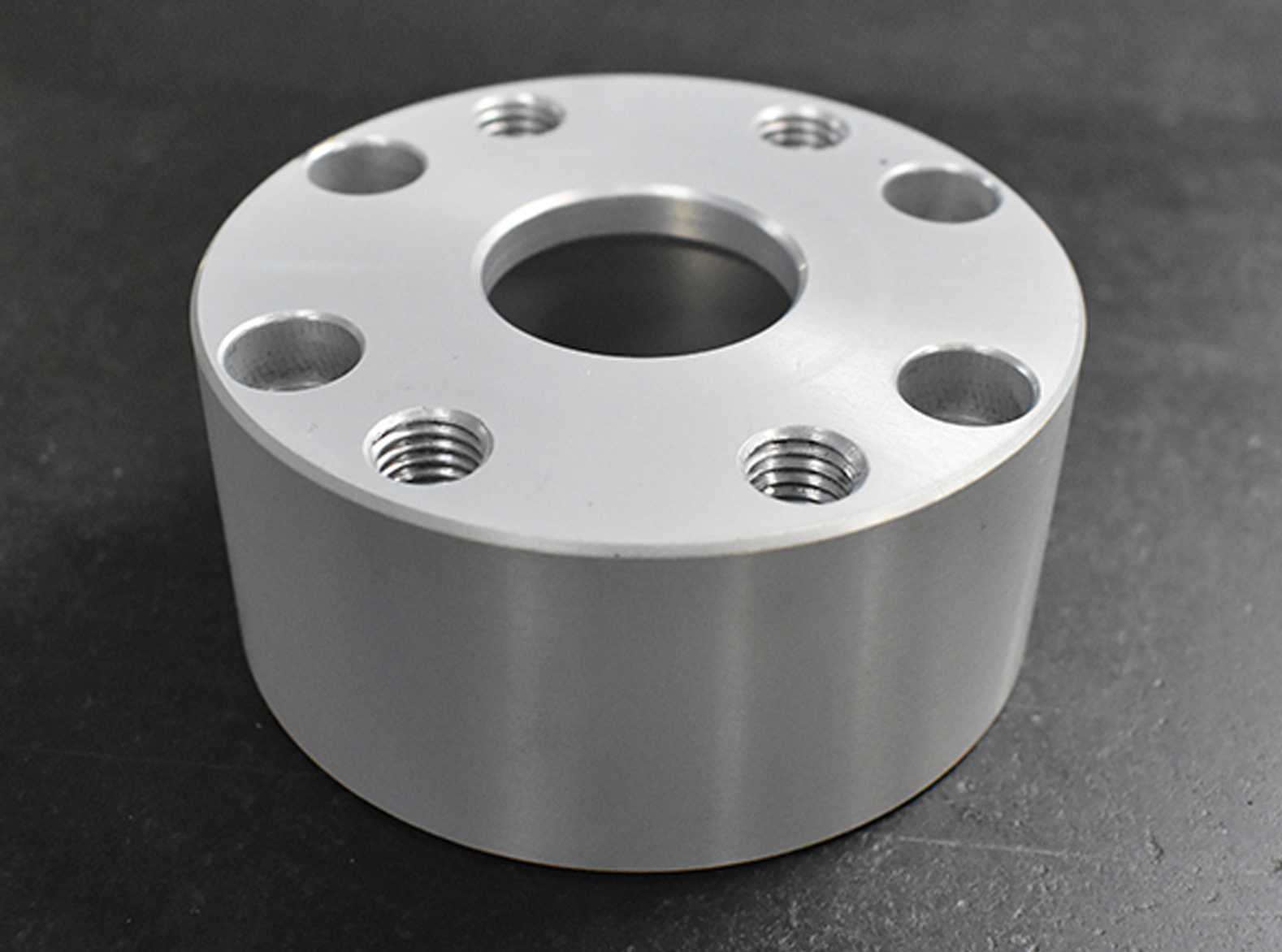 Industrial silver aluminum round hydraulic manifold block (cylindrical, multi-port, CNC-machined, threaded holes)